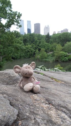 Das bin ich im „Senträl Park“ auf so einem Berg aus Stein. Das war schön da! Da konnte man toll faul sein und in der Sonne rumliegen oder picknicken. Und ich habe ein paar Tiere kennengelernt. Ein ziemlich hektisches Eichhörnchen und schwimmende Schildkröten und ein paar Enten.
